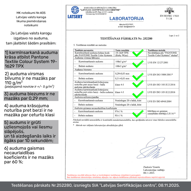 Karogs izgatavots atbilstoši Latvijas Republikas normatīvajiem aktiem par valsts karoga lietošanu.