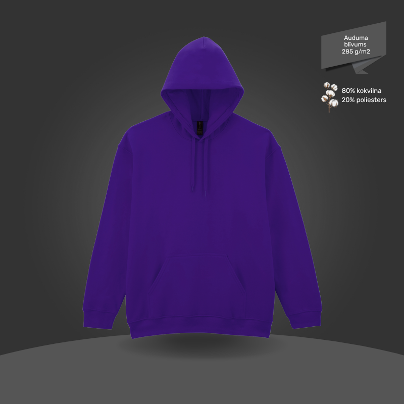 Izgatavots no kvalitatīva kokvilnas un poliestera maisījuma, ar mīkstu iekšpusi papildu komfortam un izturīgu formu arī pēc mazgāšanas. Klasisks unisex piegriezums ar priekšējo kabatu un regulējamu kapuci, pieejams dažādās krāsās un piemērots arī apdrukai.