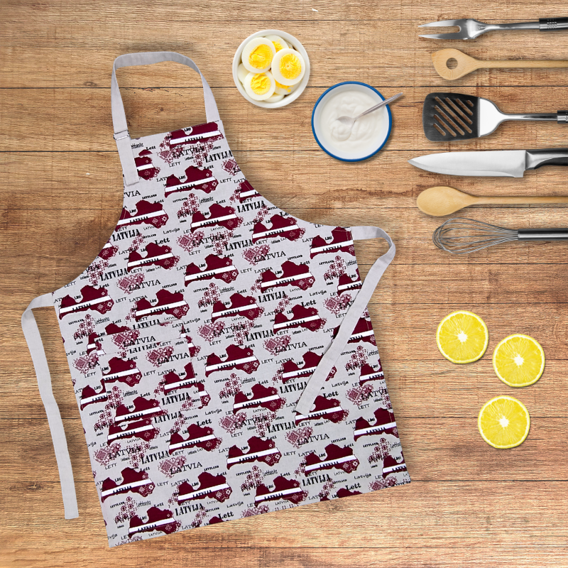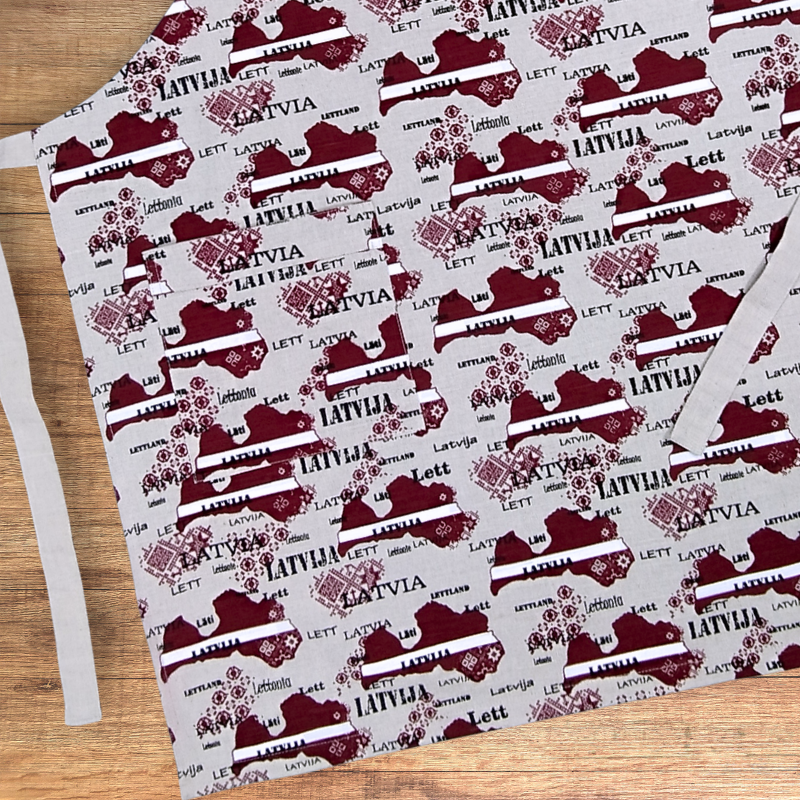 Dizains “Latvija” atspoguļo mūsu tautas spēku, sīkstumu un lepnumu par saknēm. Rakstā apvienoti Latvijas kontūras silueti, tautas rakstu zīmes un vārdi, kas dažādās valodās nosauc mūsu zemi. Tas ir mūsdienīgs patriotisma vēstījums – vienlaikus cieņpilns un vizuāli elegants, kas piestāv gan svētku galdam, gan ikdienas virtuvei. Šis priekšauts ir kā neliels simbolisks atgādinājums par to, cik skaisti ir būt mājās – savā Latvijā.