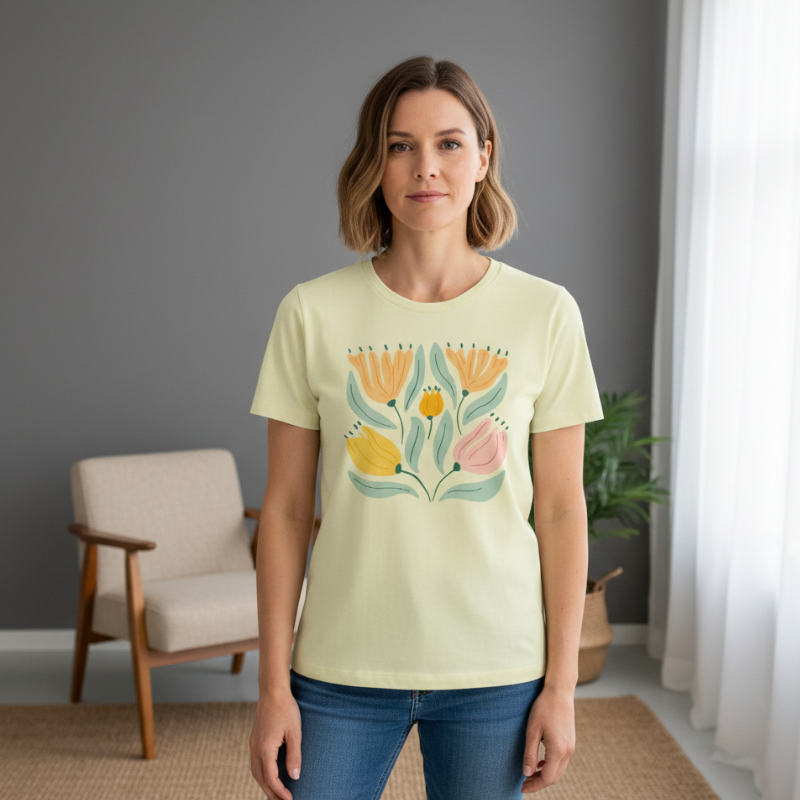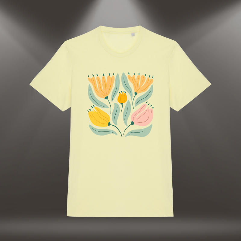 Dizains: smalki stilizēta ziedu kompozīcija pasteļtoņos, kur siltie dzeltenie un persiku akcenti harmoniski saplūst ar mierīgām zaļganām lapām. Dizains rada vieglu, līdzsvarotu noskaņu un būs elegants, neuzkrītošs akcents ikdienas garderobē.