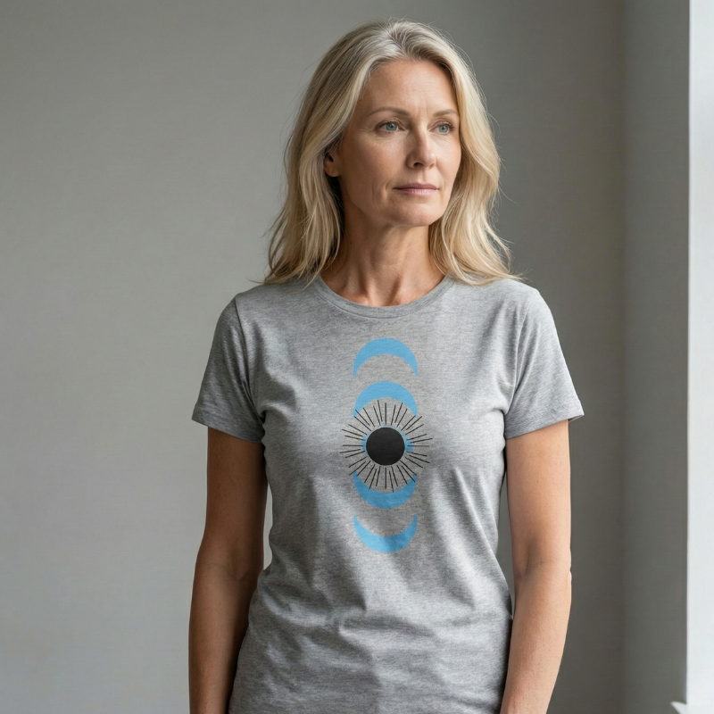 Kontrasts starp tumšo centru un vieglajām, puslokveida līnijām rada mierīgu spriegumu. Dizains simbolizē fokusu bez uzspiešanas.
